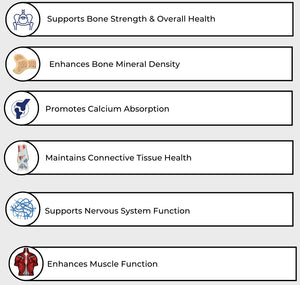 Magnesium plays a major role in bone formation as approximately 50% of magnesium found in the body is found in the bone. Magnesium plays numerous roles in bone health including increasing calcium absorption, acting as a cofactor for alkaline phosphatase activation, and supporting vitamin D3 conversion in the body. Magnesium deficiency is very common– many Americans fail to acquire even the estimated average requirement (EAR).3 Magnesium deficiency can also be exacerbated due to factors such as excess consumption of alcohol, salt, coffee, phosphoric acid in sodas, and long-term stress.4 In a study examining the effects of magnesium in a group of postmenopausal women, supplementation with 250 to 750 mg/day of magnesium for six months, followed by 250 mg/day for six to 18 months, resulted in significant bone-enhancing affects in 71% of the women.5 This increase was a significant finding that reflects the importance of magnesium supplementation alone (without calcium) as a crucial mineral for supporting bone health.
