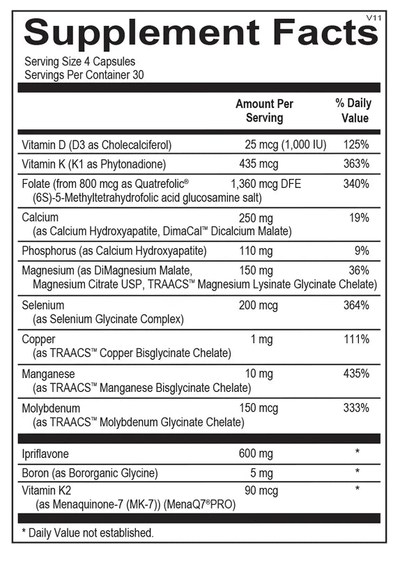 Bone mineral density (BMD) is a major determinant of bone mass and is the most commonly measured quality of bone. A number of factors contribute to BMD including lifestyle factors (regular physical activity, not smoking, minimizing stress levels) and maintaining hormonal balance. Consuming a healthy diet and ensuring optimal levels of bone-building vitamins and minerals are key strategies for preserving bone strength. BMD is determined by a lifelong process called bone remodeling. Bone remodeling occurs when bone tissue is removed from the skeleton (bone resorption) and new bone tissue is formed. Osteoclasts are cells involved with breaking down bone, while osteoblasts create a protein matrix primarily of collagen, resulting in the remineralization of bone and thereby promoting bone formation. While calcium is an effective starting point for promoting bone health, other nutrients are required for bone mineralization. Nutrients such as calcium, magnesium, boron, vitamin K and D and trace minerals significantly enhance the bone mineralization process. Ipriflavone† Isoflavones are plant-based compounds that resemble estrogen at the molecular level. In the bone tissue, isoflavones act as balanced, estrogenlike hormones which activate osteoblast cells, promoting new bone formation. Isoflavones also increase cell-signaling proteins that may inhibit the bone-absorbing activity of osteoclast cells. Ipriflavone is an isoflavone derivative which has been shown in human and animal research to support bone function and strength. In a double-blind, two-year study which included 149 women (6579 years old), the control group receiving ipriflavone (200 mg, three times per day) demonstrated increased bone strength along with improvements in bone function and mobility.1 also increase cell-signaling proteins that may inhibit the bone-absorbing activity of osteoclast cells. Ipriflavone is an isoflavone derivative which has been shown in human and animal research to support bone function and strength. In a double-blind, two-year study which included 149 women (6579 years old), the control group receiving ipriflavone (200 mg, three times per day) demonstrated increased bone strength along with improvements in bone function and mobility.1
