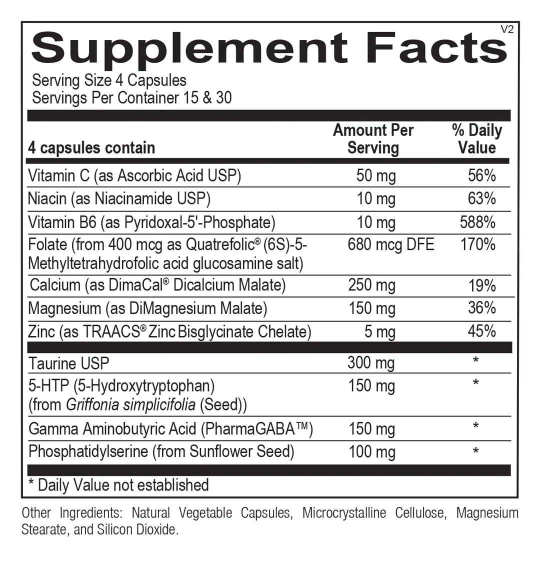 Sleep Max includes essential nutrients that are required cofactors for the synthesis of serotonin and GABA. This includes 5-methyltetrahydrofolate (5-MTHF), vitamin B6 (P-5-P), vitamin C, zinc and magnesium to enhance neurotransmitter synthesis.